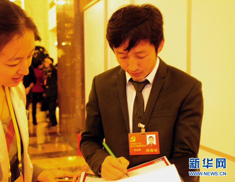 中国共产党第十八次全国代表大会闭幕会11月14日上午在人民大会堂举行。图为十八大代表、北京奥运会男子拳击48公斤级金牌以及伦敦奥运会男子拳击49公斤级获得者邹市明在“新华微博”留言簿上留言。新华网 谢筱淼 摄