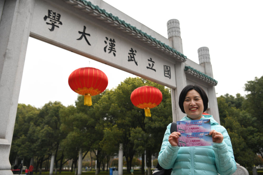 3月13日,周国红在武汉大学樱花大道参观。