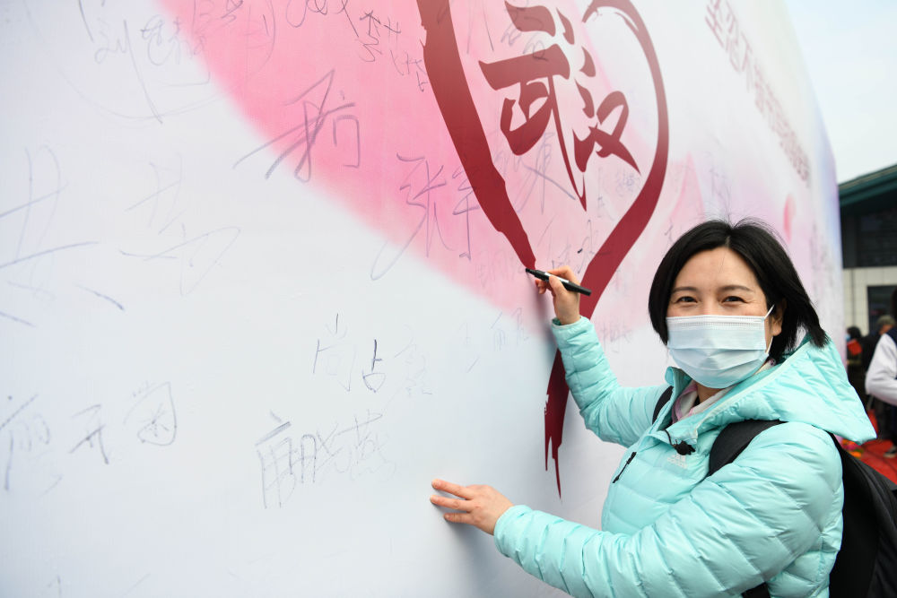 3月13日,周国红在武汉大学援鄂抗疫医护人员赏樱专场活动中签名留念。