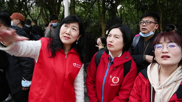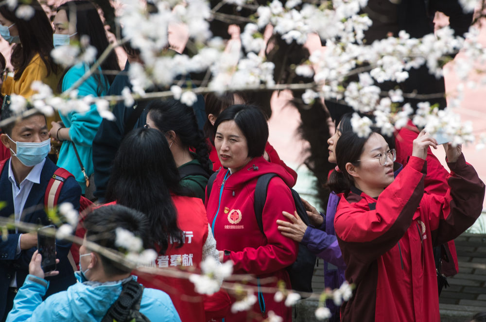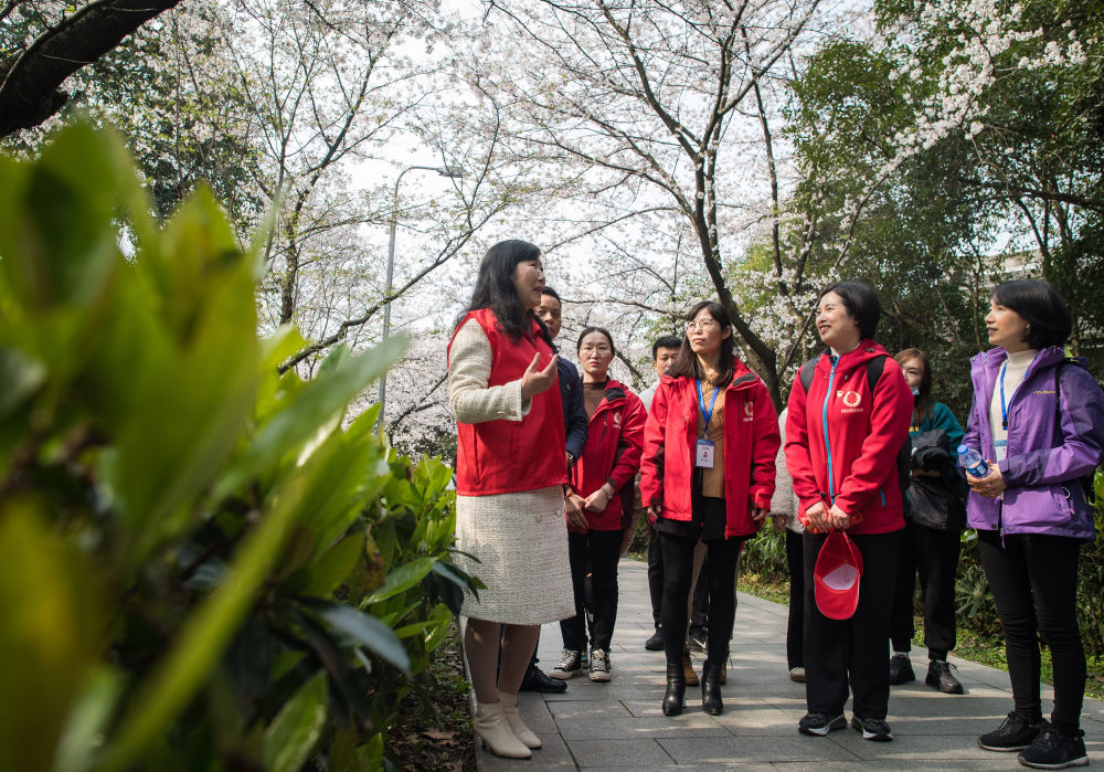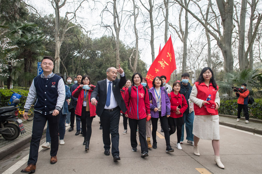 3月13日,周国红(中)在武汉大学樱花大道参观。
