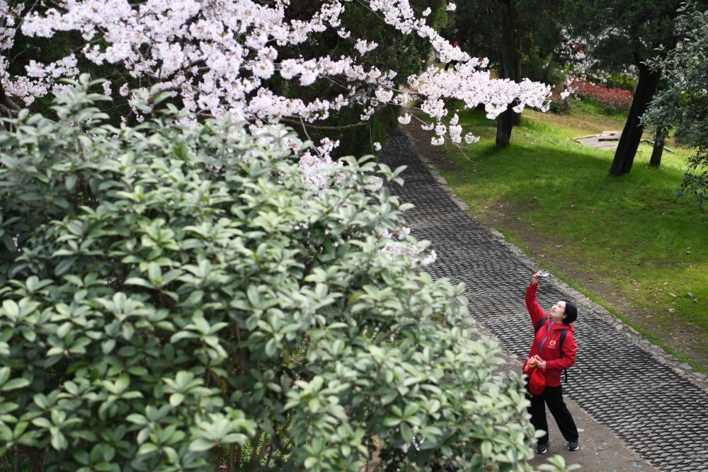 3月13日,周国红在武汉大学樱花树下拍照。
