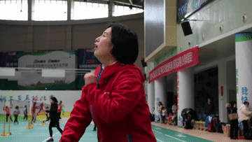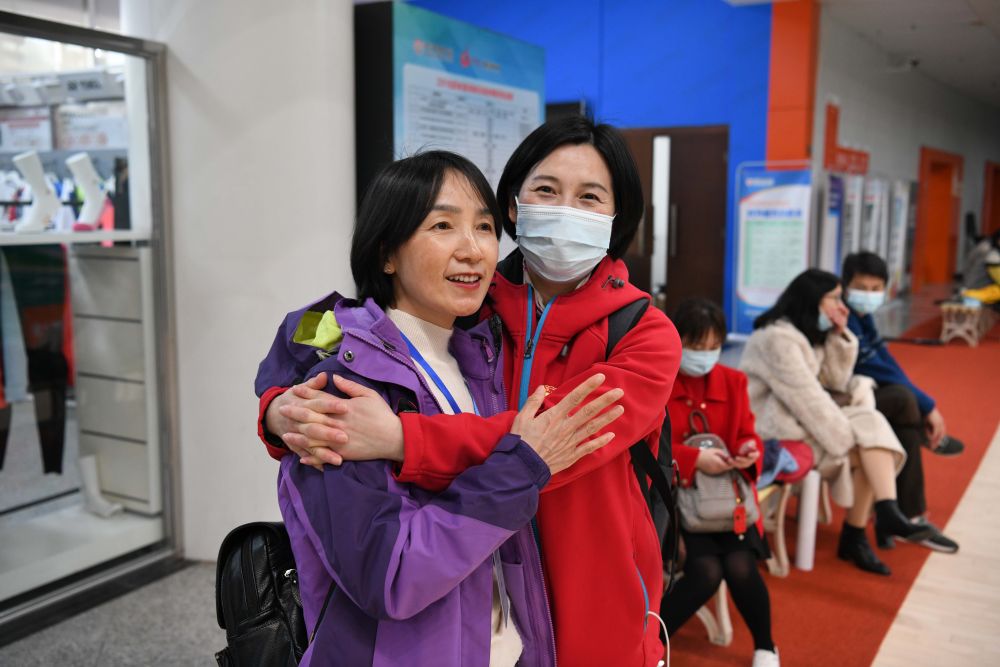 3月13日,周国红(前右)在武汉体育中心内。这里曾作为方舱医院使用。