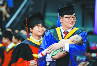 清华大学2014年研究生毕业典礼举行,硕士生仲晓波和同在清华攻读博士的妻子陈程抱着4月份刚出生的孩子参加毕业典礼。本报记者 和冠欣摄