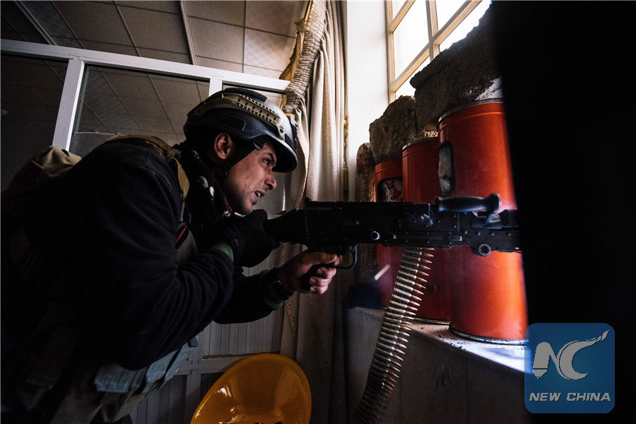 A member of the Iraqi special forces' Counter-Terrorism Service (CTS) fires his machine gun as he holds a position inside Mosul's university on January 15, 2017, during an ongoing military operation against Islamic State (IS) group jihadists. (AFP/Xinhua)