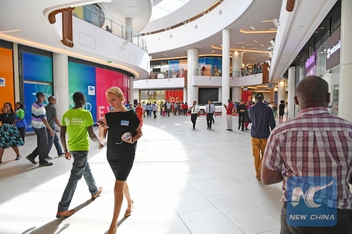 Customers walk inside the Two Rivers Mall in Nairobi, Kenya, Feb. 17, 2017. The Two Rivers Investment Project, which consists of five star hotels, office blocks, residential homes and shops occupied by major retail enterprises, was launched here on Friday at a ceremony attended by Kenyan President Uhuru Kenyatta, Chinese Ambassador to Kenya Liu Xianfa and investors. (Xinhua/Sun Ruibo)