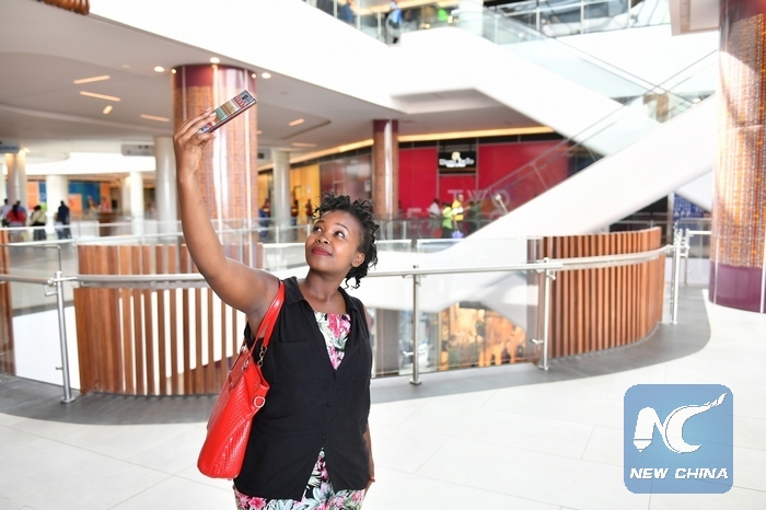 A customer takes selfies at the Two Rivers Mall in Nairobi, Kenya, Feb. 17, 2017. The Two Rivers Investment Project, which consists of five star hotels, office blocks, residential homes and shops occupied by major retail enterprises, was launched here on Friday at a ceremony attended by Kenyan President Uhuru Kenyatta, Chinese Ambassador to Kenya Liu Xianfa and investors. (Xinhua/Sun Ruibo)