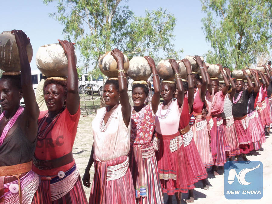 Local women carry clay-pots filled with Omagongo (marula juice) in Windhoek, Namibia, Dec. 3, 2015. (Xinhua/Nampa)