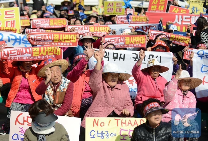 Protesters shout slogans during a rally near the golf course where the Terminal High Altitude Area Defense (THAAD) system will be deployed in Seongju, South Korea, March 15, 2017. (Xinhua/Liu Yun)