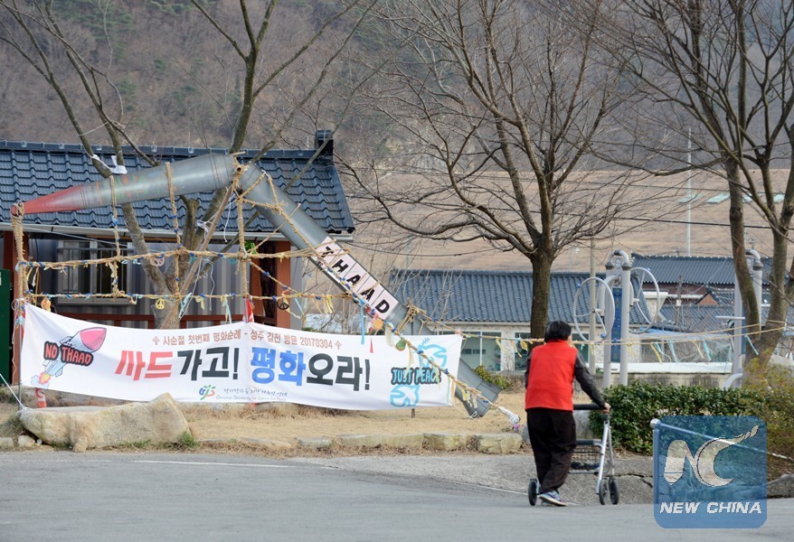 A villager walks past an anti-THAAD banner at the Soseong-ri village in Seongju county, North Gyeongsang province, South Korea, March 14, 2017. (Xinhua/Liu Yun)