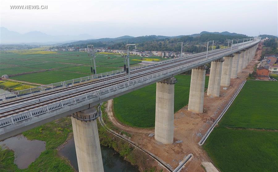 This aerial photo taken on March 30, 2017 shows the newly-built Wangjiaba bridge of the railway line for passenger transport in southwest China's Sichuan Province. The 250-km-per-hour inter-city passenger line will link Xi'an, capital of northwest China's Shaanxi Province, with Sichuan's capital Chengdu. As the construction is nearly to be completed, it will become the country's first high-speed railway passing through the Qinling Mountains. (Xinhua/Xue Yubin)