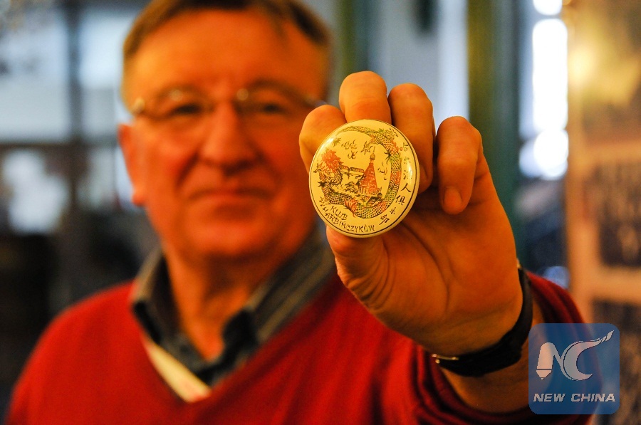 Romuald Oziewicz, chairman of the Polish Harbiners Club, shows the badge of his club on April 8, 2017. (Xinhua/Shi Zhongyu)