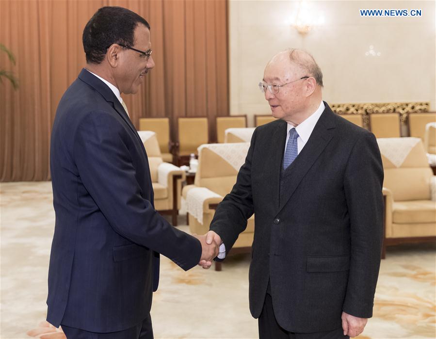 Chen Yuan (R), vice chairman of the National Committee of the Chinese People's Political Consultative Conference (CPPCC), meets with a Nigerien Party for Democracy and Socialism (PNDS) delegation headed by Mohamed Bazoum, president of PNDS national political bureau and Interior and Public Security Minister of Niger, in Beijing, capital of China, April 12, 2017. (Xinhua/Ding Haitao)