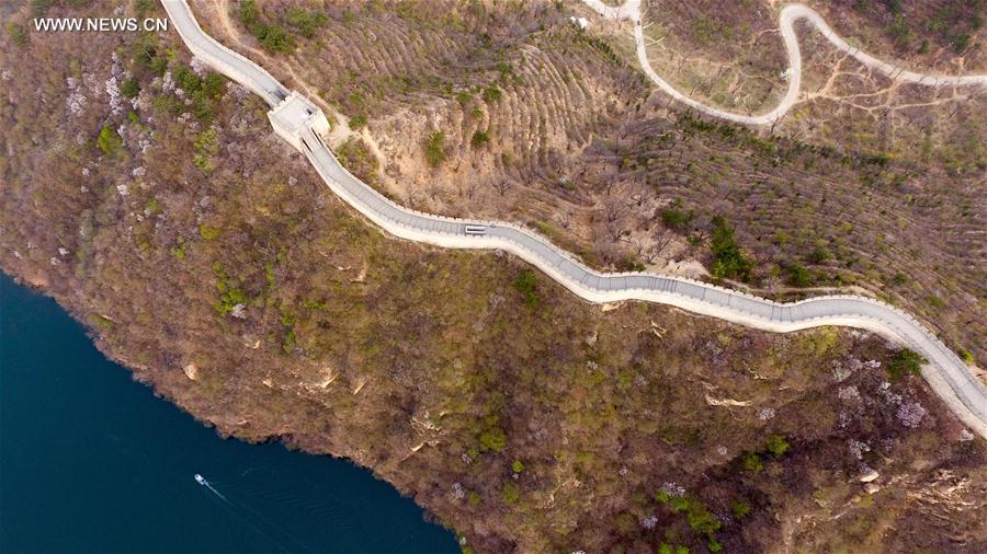 Aerial photo taken on April 10, 2017 shows a boat float on a river at the Huanghuacheng Lakeside Great Wall Reserve in the Huairou District of Beijing, capital of China. (Xinhua/Chen Yehua)