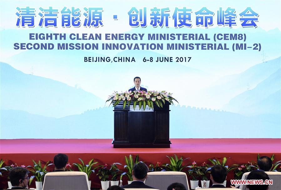 Chinese Vice Premier Zhang Gaoli delivers a speech at the opening of the Eighth Clean Energy Ministerial and the Second Mission Innovation Ministerial in Beijing, capital of China, June 7, 2017. (Xinhua/Zhang Ling)