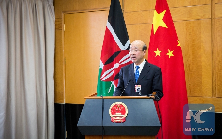 Chinese Ambassador to Kenya Liu Xianfa delivers a speech during a ceremony to bid farewell to Kenyan students who have received scholarships to study in China, in Nairobi, Kenya, on Aug. 24, 2017. A ceremony was held at the Chinese Embassy in Kenya on Thursday to bid farewell to 140 Kenyan students who have received scholarships to study in China. (Xinhua/Lyu Shuai)