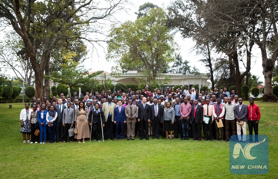 Participants pose for photos after a ceremony to bid farewell to Kenyan students who have received scholarships to study in China, in Nairobi, Kenya, on Aug. 24, 2017. A ceremony was held at the Chinese Embassy in Kenya on Thursday to bid farewell to 140 Kenyan students who have received scholarships to study in China. (Xinhua/Lyu Shuai)