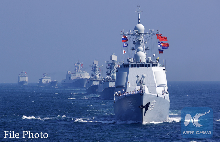 Chinese officers and soldiers waves to say goodbye to Russian fleet during a China-Russia naval joint drill at sea off south China's Guangdong Province, Sept. 19, 2016. (Xinhua/Zha Chunming)