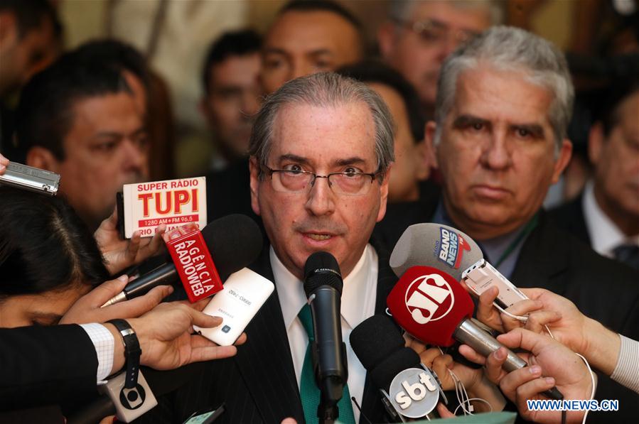 BRASILIA, July 8, 2016 (Xinhua) -- Eduardo Cunha (C), the suspended President of the Chamber of Deputies in Brazil, speaks during a news conference at Congress in Brasilia, capital of Brazil, on July 7, 2016. The suspended President of the Chamber of Deputies in Brazil formally resigned Thursday although he will remain a deputy. (Xinhua/Andre Dusek/Agencia Estado)