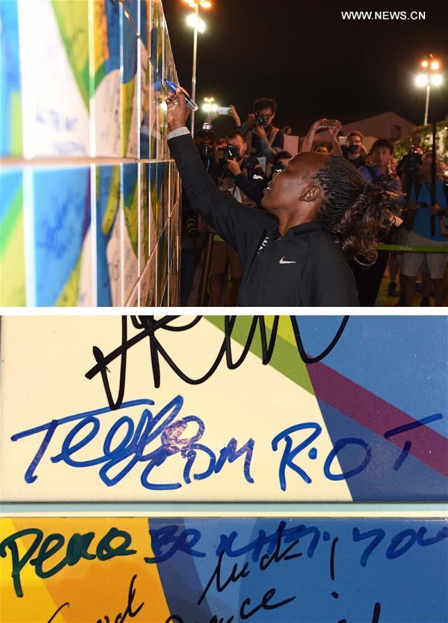 This combo photo shows Tegla Loroupe, athlete of Olympic Refugee Team, signs on the Olympic Truce Wall in the Olympic Village (up) and her signature (down) in Rio de Janeiro, Brazil, on Aug. 3, 2016. (Xinhua/Yue Yuewei)