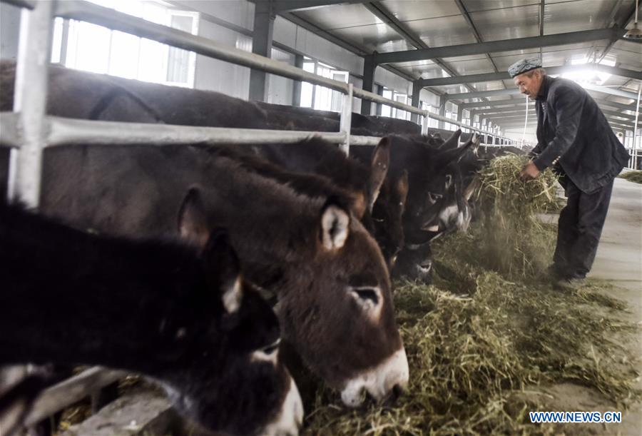 A farmer feeds donkeys at Suluk Village in Akto County, northwest China's Xinjiang Uygur Autonomous Region, Oct. 22, 2016. The annual income per capita of the villagers increased nearly 1,000 RMB by donkey raise. (Xinhua/Zhao Ge)