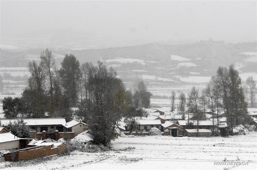 Photo taken on Oct. 28, 2016 shows the snow scenery of Luming Village of Weiyuan County, northwest China's Gansu Province. (Xinhua/Fan Peishen)