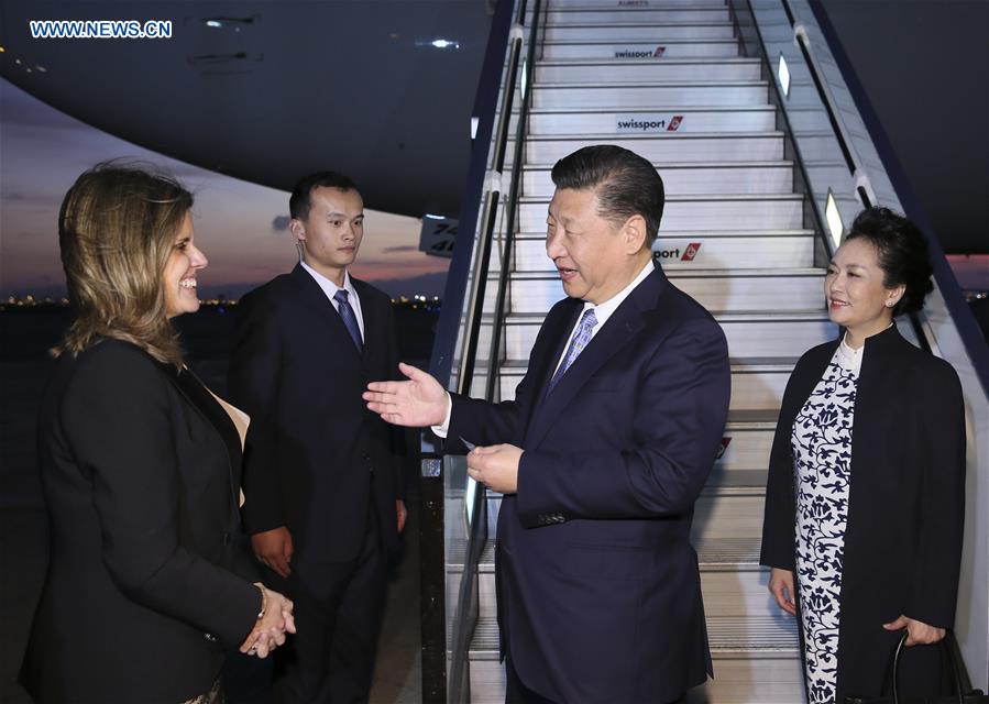 Chinese President Xi Jinping (2nd R) and his wife Peng Liyuan (1st R) are received by Peruvian Second Vice President Mercedes Araoz (1st L) at the airport in Lima, Peru, Nov. 18, 2016. Xi arrived in Peru Friday to attend the upcoming Asia-Pacific Economic Cooperation (APEC) Economic Leaders' Meeting and pay his first state visit to Peru. (Xinhua/Lan Hongguang)