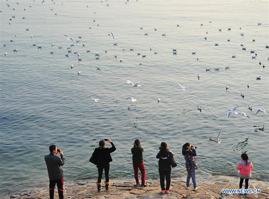 Tourists take photos of sea gulls on the seaside in Qingdao, east China's Shandong Province, Nov. 25, 2016. Lots of sea gulls fly to Qingdao from north to spend winter from October to April every year. (Xinhua/Shao Kun)