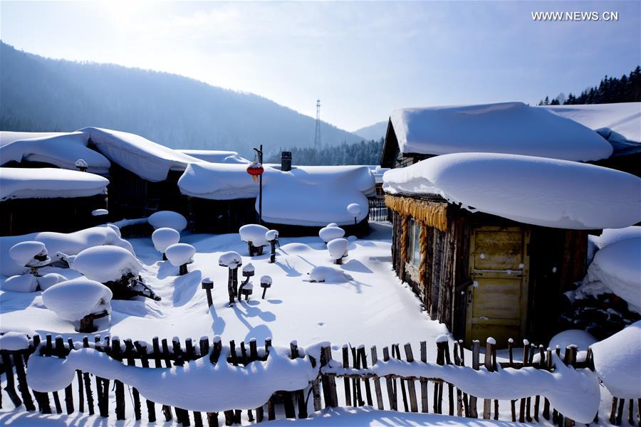 Photo taken on Jan. 19, 2017 shows houses in Xuexiang scenic spot, Mudanjiang, northeast China's Heilongjiang Province. Covered with snow for seven months per year, the amazing landscape of Xuexiang scenic spot attracts lots of tourists. (Xinhua/Chu Yang)