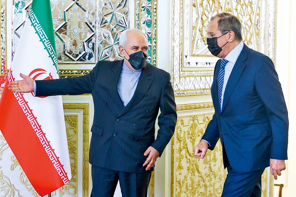 4月13日,伊朗外长扎里夫(左)在德黑兰迎接到访的俄罗斯外长拉夫罗夫