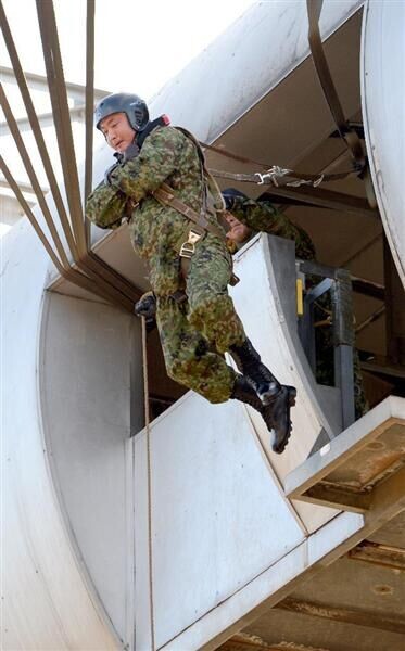 【环球军事报道】11日,日本新防卫大臣中谷元到陆上自卫队驻地视察,亲自体验11米高的跳伞训练,称要“做好表率”。