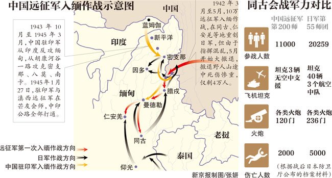 1943年10月中国驻印军从印度反攻缅甸,1944年5月中国远征军滇西部队发动反攻,至1945年3月,中国远征军取得入缅作战的最后胜利。入缅作战的胜利,鼓舞了全国军民抗战信心,重新打通了国际交通线;同时揭开了正面战场对日反攻的序幕。