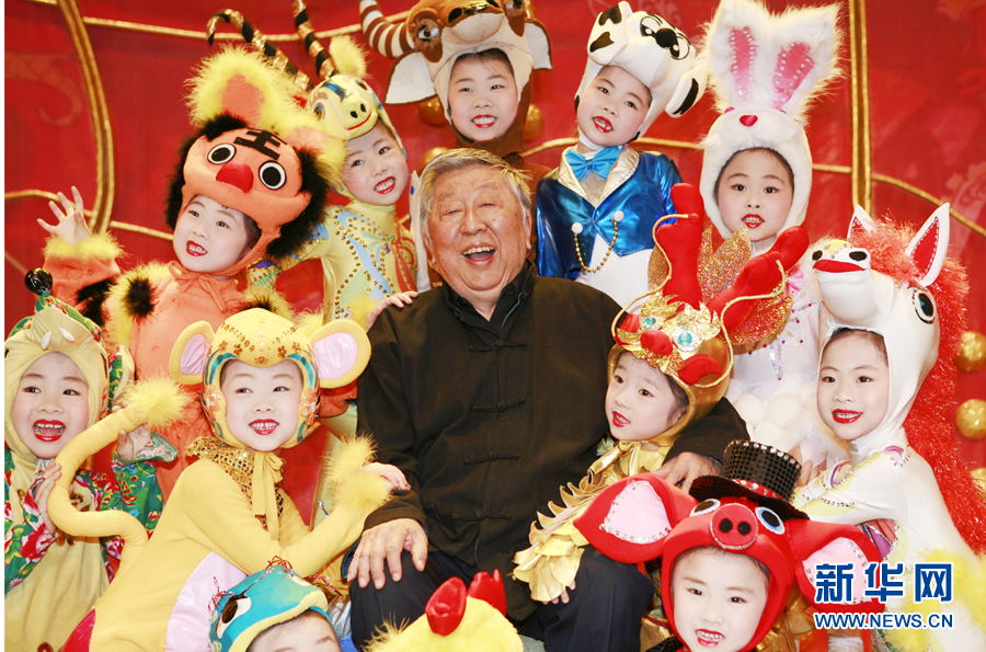 资料图片:2008年,阎肃和儿童们在一起。(图片由空军宣传部提供)