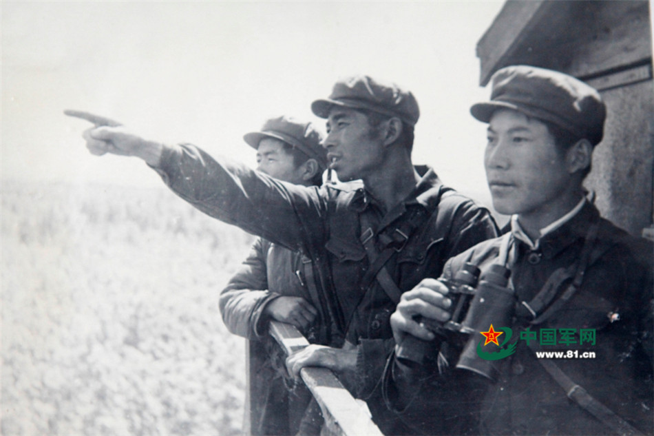 上世纪六十年代,孙吴县人武部专武干部和民兵在边境线瞭望塔上一起站岗执勤。