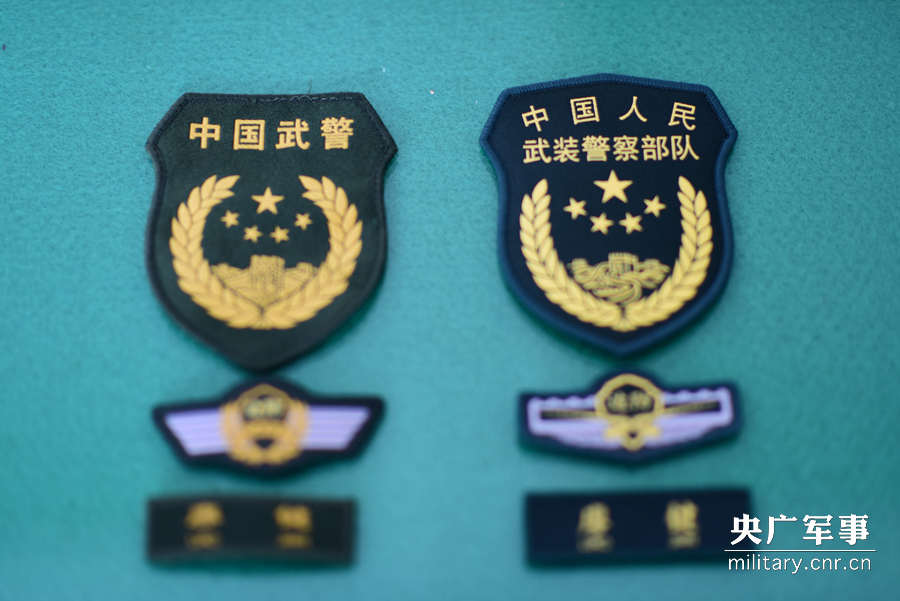 图为武警臂章、胸标、姓名牌;左为老式,右为新式。