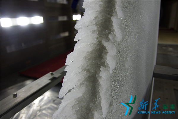 2013年10月,均匀的水雾从上千个喷嘴中喷涌而出,温度曲线不断下降,从20℃到0℃,再到零下20℃、零下30℃,试验模型上的冰凌从无到有,慢慢变白变厚……
