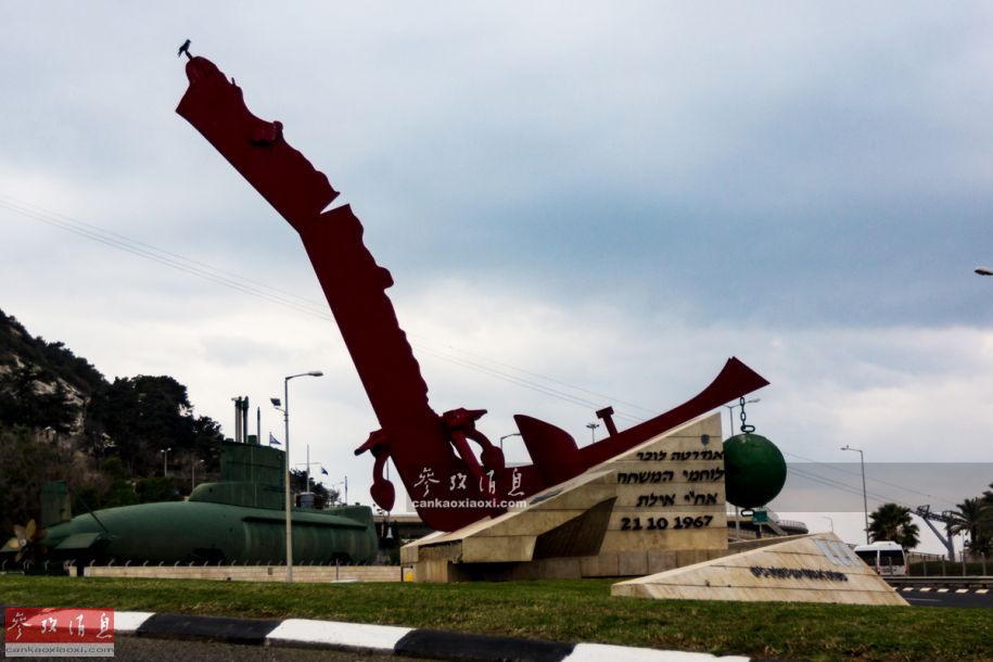 初到博物馆附近,首先看到的是图中位于博物馆门外路口的“埃拉特”号驱逐舰纪念碑,用于纪念在1967年10月27日(第三次中东战争期间),被埃及海军导弹艇发射的“冥河”反舰导弹击沉的“埃拉特”号全舰官兵,背景可见以海军的“海浪”号潜艇。