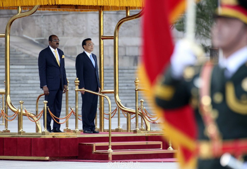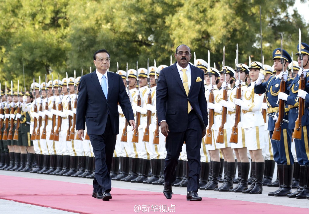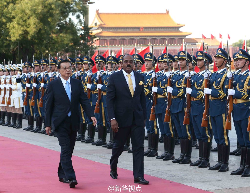 新华网北京8月26日电 据新华社“新华视点”微博报道,26日下午,国务院总理李克强在人民大会堂东门外广场举行仪式,欢迎来华进行正式访问的安提瓜和巴布达总理贾斯顿·布朗。