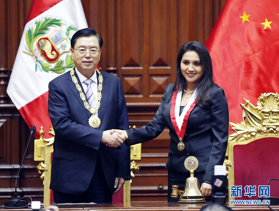 11月21日,正在秘鲁进行正式友好访问的全国人大常委会委员长张德江在利马与秘鲁国会主席索洛萨诺举行会谈。这是会谈结束后,索洛萨诺代表秘鲁国会授予张德江委员长“大十字勋章”。新华社记者刘建生摄