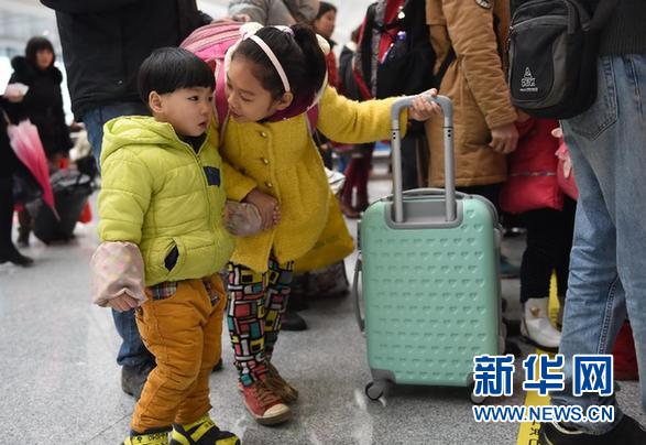 2月4日,在广西南宁市南宁火车东站,一名小姑娘在进站中帮助父母照看弟弟和行李。当日,为期40天的2015年春运大幕正式开启。据交通运输部消息,预计2015年春运全国旅客发送量将达到28.07亿人次,比2014年增长3.4%。新华社记者 周华 摄