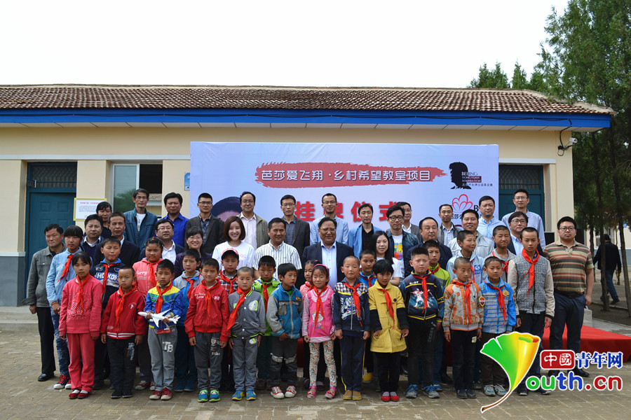 芭莎爱飞翔·乡村希望教室项目挂牌仪式在甘肃省兰州市榆中县三角城乡的大兴营小学里举行。图为挂牌仪式现场全体嘉宾、媒体及项目学校师生合影。 主办方供图
