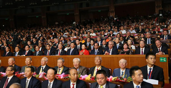 9月3日,习近平、李克强、张德江、俞正声、刘云山、王岐山、张高丽等党和国家领导人与6000名中外人士在北京人民大会堂共同观看纪念中国人民抗日战争暨世界反法西斯战争胜利70周年文艺晚会《胜利与和平》。新华社记者 兰红光 摄