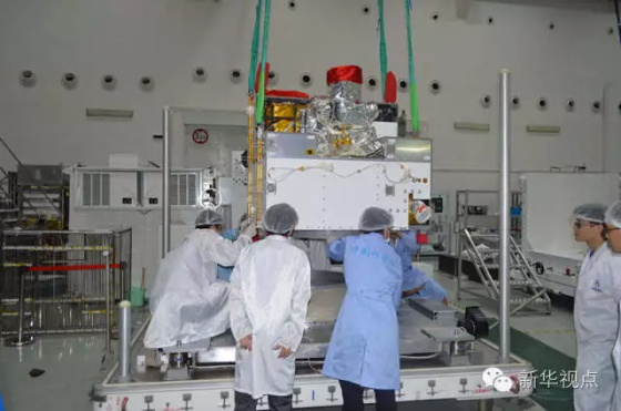 在酒泉卫星发射中心,量子科学实验卫星在进行有效载荷光学性能测试(2016年7月21日摄)。新华社发(中科院微小卫星创新研究院供图)