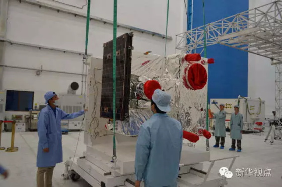 在酒泉卫星发射中心,量子科学实验卫星在安装太阳翼(2016年7月27日摄)。新华社发(中科院微小卫星创新研究院供图)