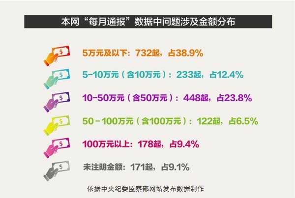 梳理本网“每月通报”的1884起问题,涉及金额在5万元及以下的有732起,占38.9%。