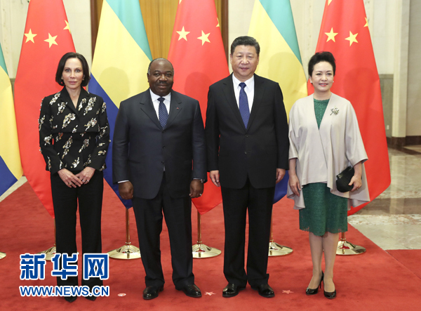 12月7日,国家主席习近平在北京人民大会堂同加蓬总统邦戈举行会谈。会谈前,习近平在人民大会堂北大厅为邦戈举行欢迎仪式。这是习近平和夫人彭丽媛同邦戈总统夫妇合影。新华社记者庞兴雷摄