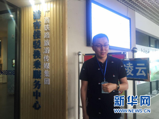 毕海斌在百色车站游客接驳换乘服务中心介绍高铁无轨站相关情况。新华网 聂晨静 摄