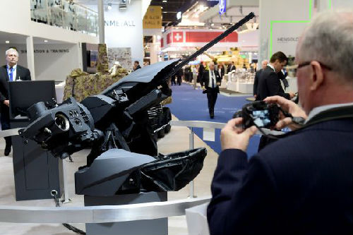 2017年2月,一名参观者在阿布扎比国际防务展上拍摄参展武器。此次展览突出展示智能化、大数据等尖端科技在国际军工和防务领域的创新应用。(摄影 赵丁喆)