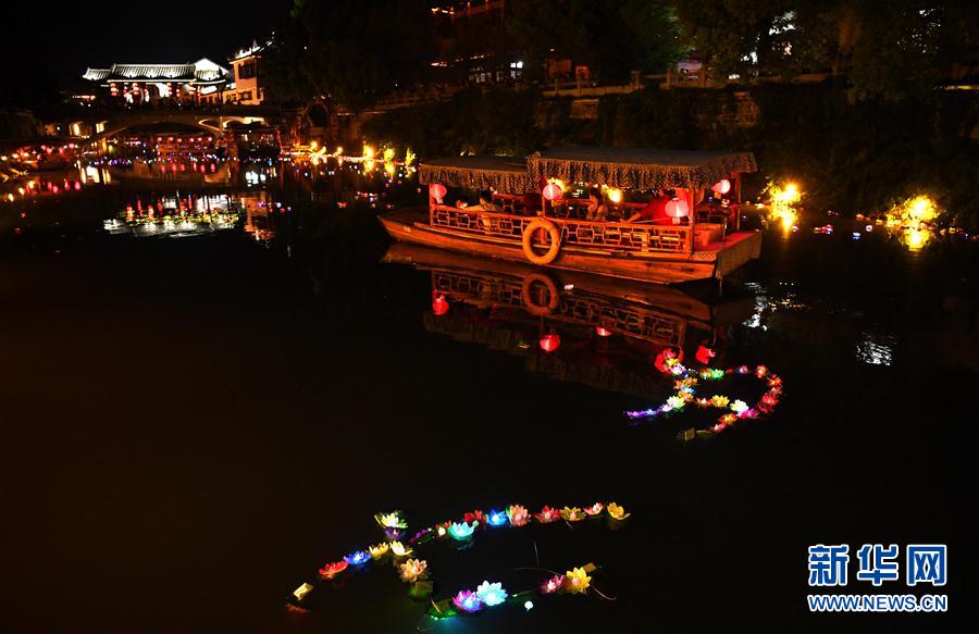 游客在三河古镇小南河观赏河灯(8月26日摄)。 新华社记者 刘军喜 摄