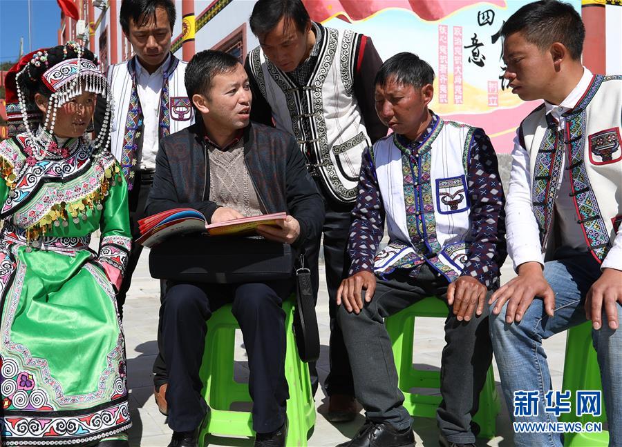 10月31日,十九大代表、贵州省六盘水市钟山区大湾镇海嘎村驻村第一书记杨波(前左二)向海嘎村彝族村民宣讲十九大精神。新华社记者 刘续 摄