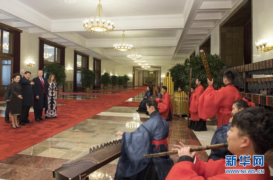 9日,习近平和夫人彭丽媛还同特朗普夫妇在人民大会堂欣赏了文艺表演。